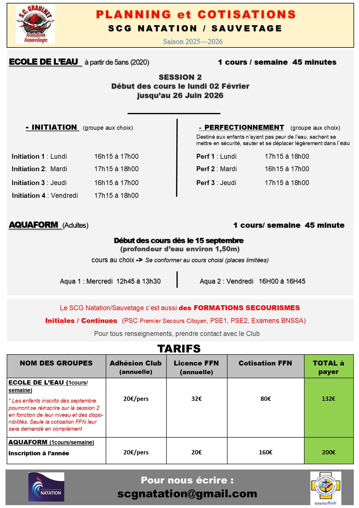 Le SCG Natation organise de nouvelles inscriptions pour la session 2 pour un début des cours "Ecole de l'Eau" groupe Initiation et Perfectionnement dès le lundi 02 Février jusqu'à la mi-juin 2026.